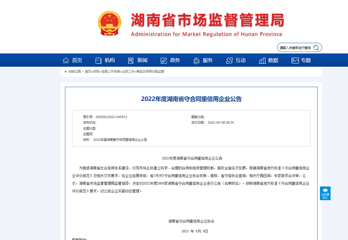 喜报丨康家环保获评为湖南省和长沙...2023年5月9日,湖南省市场监督管理局公示了2022年度守合同重信用企业名单,经过企业申报、各市市场监管局推荐,相关部门严格...